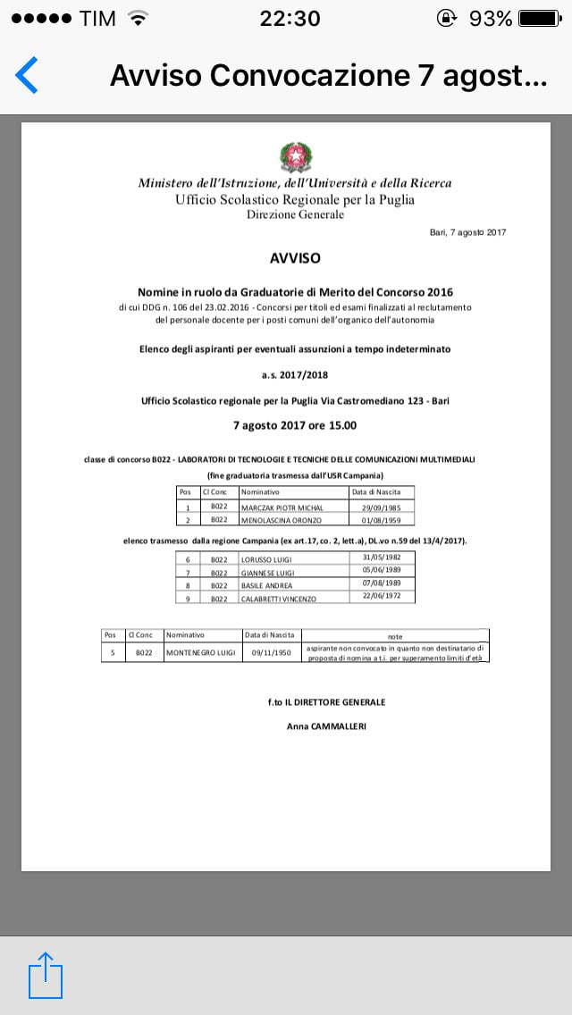 Il prof. come si evince dall’allegato presente sul sito del Miur Puglia è giunto quinto al concorso; dettaglio non da poco perché inizialmente le cattedre messe a concorso per quella disciplina era quattro, quindi possiamo affermare che nello scorso anno 2016/2017, il prof. non risultava né primo, né vincitore di cattedra e ancora nei termini di età.