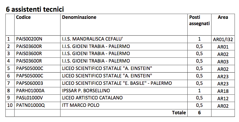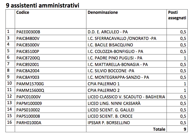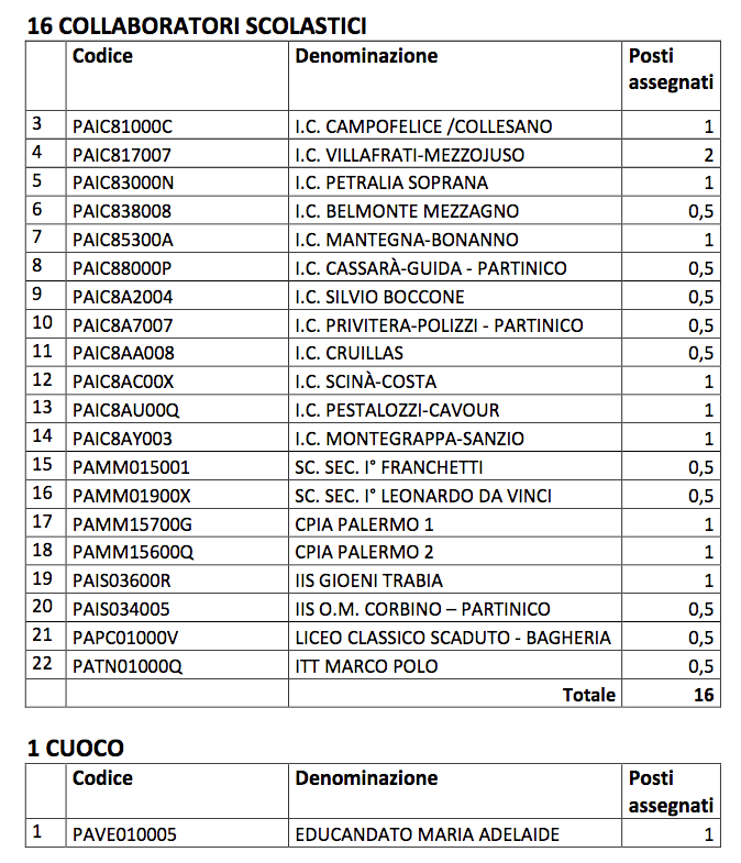 Si sono resi disponibili altri posti di personale ATA per l’anno scolastico 2018/2019. Nella nota si legge: “Per l’anno scolastico 2018/2019 in provincia di Palermo vengono istituiti in organico di fatto ulteriori 32 posti cosi? ripartiti: 9 assistenti amministrativi, 6 assistenti tecnici, 16 collaboratori scolastici, 1 cuoco distribuiti come nelle tabelle A,B,C allegate al presente decreto”.