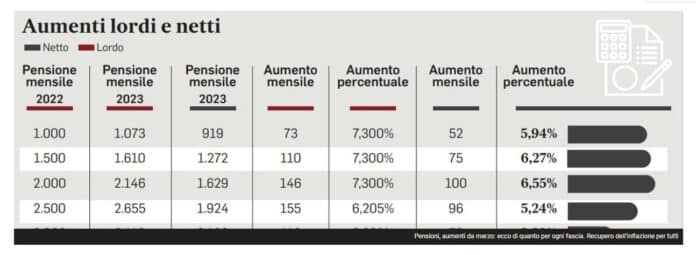 Ma non è solo questo il tema caldo riguardante le pensioni in questi giorni. Infatti, a partire da marzo ci saranno degli aumenti delle pensioni. Le pensioni fino a 2.101,52 euro lordi mensili (ovvero fino a quattro volte il trattamento minimo che è di 525,38 euro) sono state incrementate del 7,3 per cento, il tasso provvisorio che era stato fissato lo scorso novembre. Per gli assegni di importo superiore a questa soglia la rivalutazione invece non è totale, ma determinata con percentuali decrescenti.