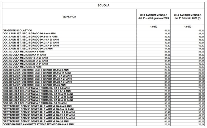 Aumento stipendi una tantum 2023 dopo il taglio dell’irpef, si tratta di pochi spiccioli, ecco le tabelle con gli aumenti di tutto il personale della scuola.