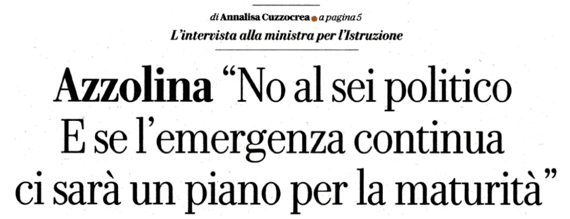 La ministra dell’Istruzione Lucia Azzolina in un’intervista rilasciata oggi al quotidiano La Repubblica rigetta la possibilità del 6 politico, ma si dice pronta ad un piano di emergenza per la maturità.
