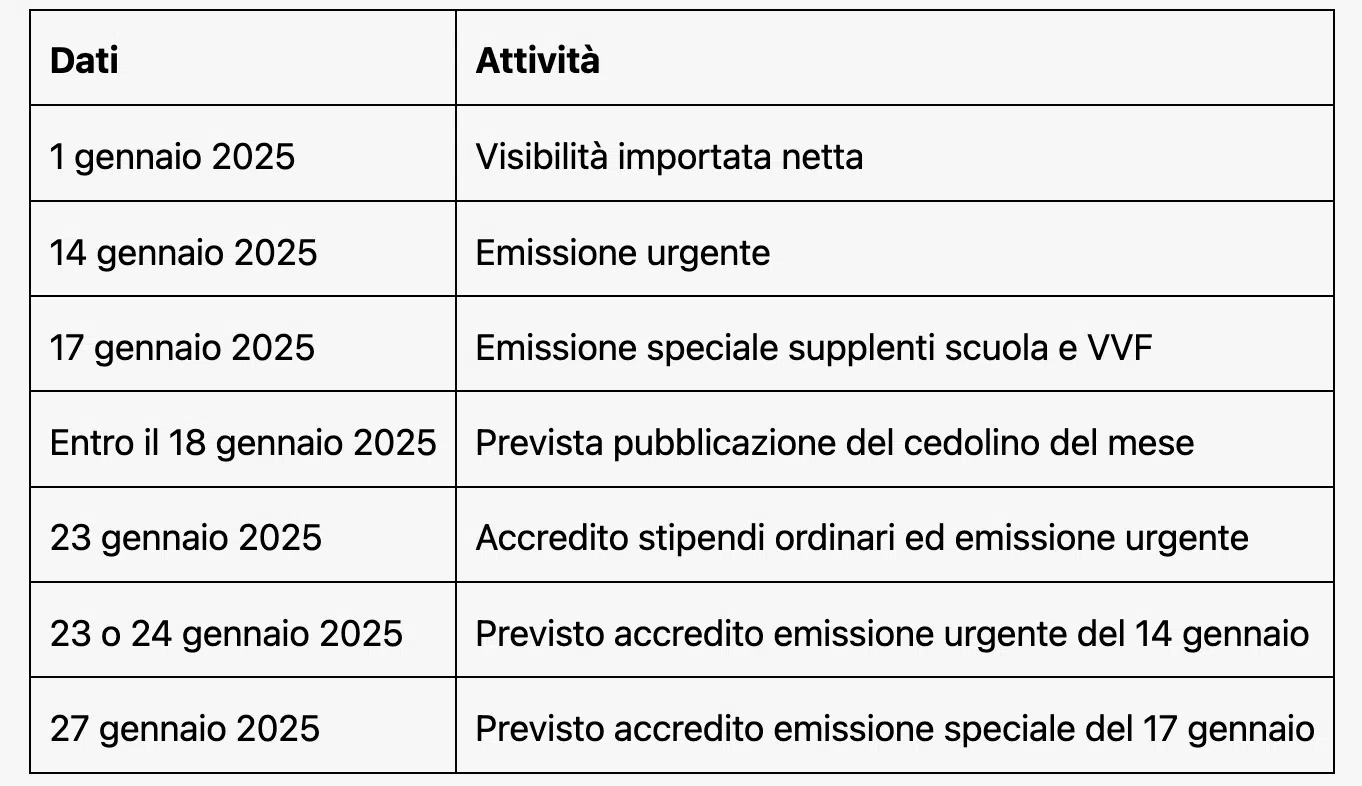 - Emissione ordinaria: riguarda la maggior parte dei dipendenti pubblici ed è iniziata il 30 dicembre 2024 alle ore 14:00. Gli importi netti sono già visibili.