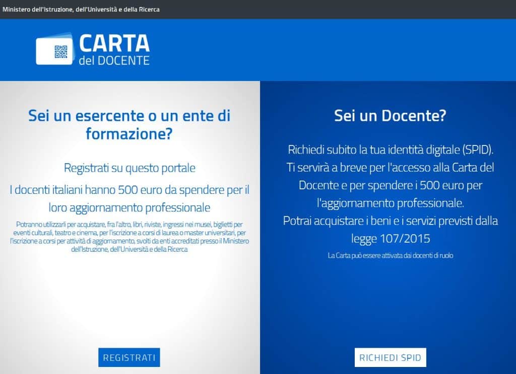 In questa fase l’home dell’app è divisa in due parte: la prima è dedicata ai confesercenti che intendono registrarsi e quindi offrire i loro prodotto/servizi ai docenti; la seconda, riguarda ancora la riechiesta dello SPID.