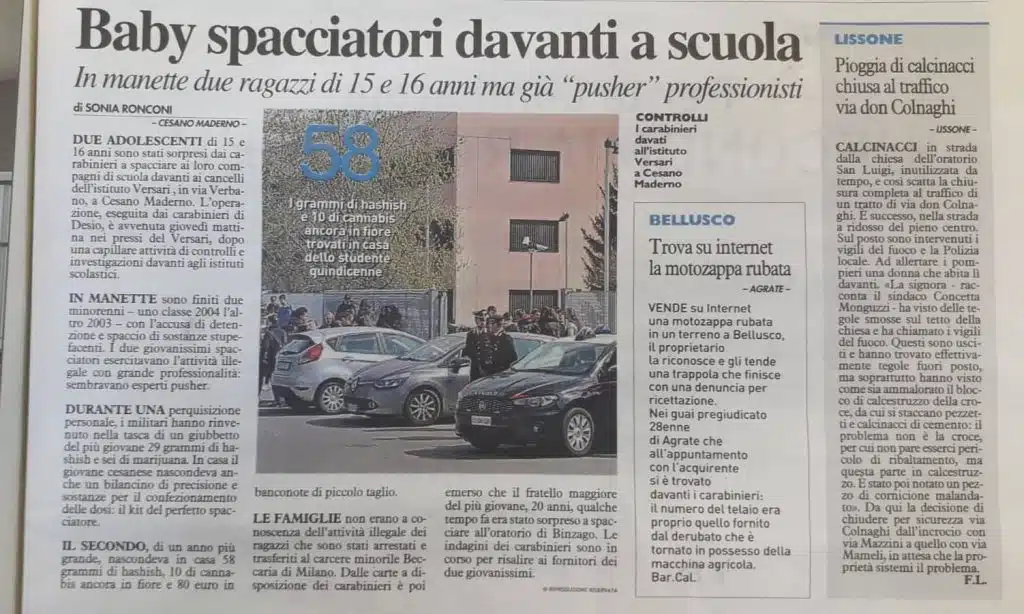 A Cesano Maderno, tranquilla cittadina in provincia di Monza, due studenti di appena 15 e 16 anni sono finiti alla sbarra perchè spacciavano droga davanti ai cancelli della scuola.