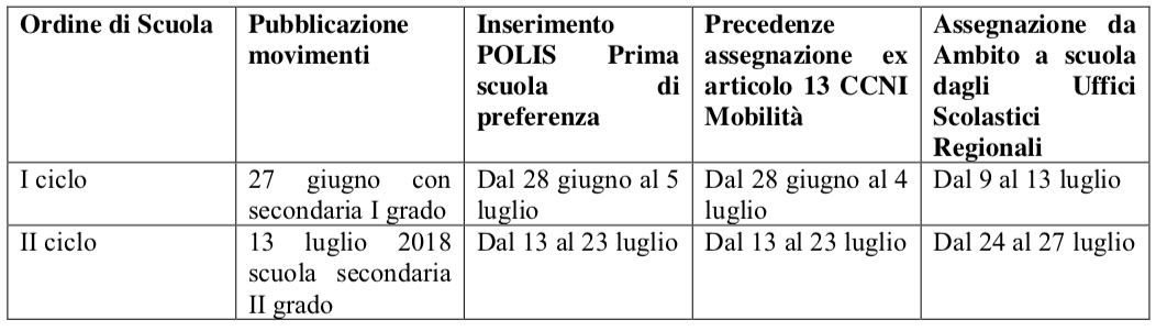 In particolare la nuova ipotesi di contratto, tiene conto nella sua articolazione della disciplina transitoria dovuta al rinnovo del CCNL di comparto, nonche? dell’ormai avvenuta pubblicazione degli esiti della mobilita? della scuola dell’infanzia, primaria e secondaria di I grado, oltre che della conclusione del lavoro dei Collegi dei docenti, fattore che non consente l’attivazione delle procedure di compartecipazione ed imparzialita? nella definizione dei criteri oggettivi di individuazione. Pertanto al fine di garantire il regolare avvio dell’anno scolastico, si prevede che per l’ a.s. 2018/19 una procedura semplificata secondo cui gli Uffici scolastici territorialmente competenti provvederanno con apposita funzione di individuazione all’assegnazione dei docenti alle scuole di riferimento, secondo la seguente tempistica: