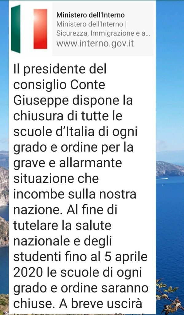 Proprio in queste ore su whatsapp sta girando un messaggio con il quale si annuncia la chiusura delle scuole fino al 5 aprile con due link ufficiali del ministero dell’Interno. Il testo è il seguente: “Il presidente del consiglio Conte Giuseppe dispone la chiusura di tutte le scuole d’Italia di ogni grado e ordine per la grave e allarmante situazione che incombe sulla nostra nazione. Al fine di tutelare la salute nazionale e degli studenti fino al 5 aprile 2020 le scuole di ogni grado e ordine saranno chiuse. A breve uscirà la disposizione ufficiale sul sito del ministero. www.interno.gov.it, https://www.interno.gov.it/it”