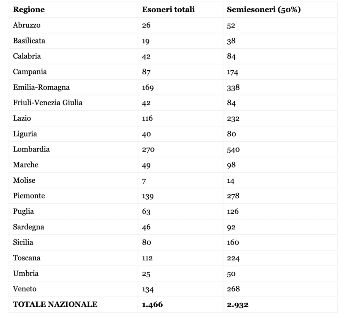 A livello nazionale, sono previsti fino a 1.466 esoneri totali o 2.932 semiesoneri al 50%, con una distribuzione che tiene conto delle esigenze regionali. Gli Uffici Scolastici Regionali si occuperanno di assegnare questi incarichi tra le università e le classi di concorso, collaborando con i Centri multidisciplinari.