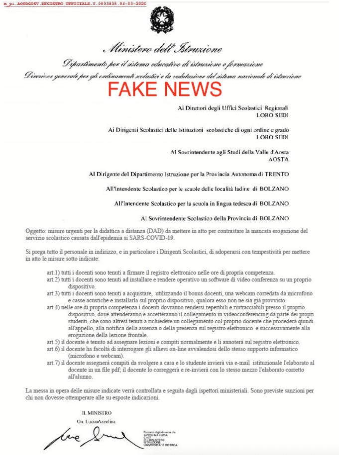 La falsificazione della nota ministeriale per di più arreca anche un numero di protocollo a dimostrazione che l’autore volesse confondere e generare disagio nei docenti che in questi giorni stanno vivendo momenti di sconforto e si stanno organizzando nella didattica a distanza.