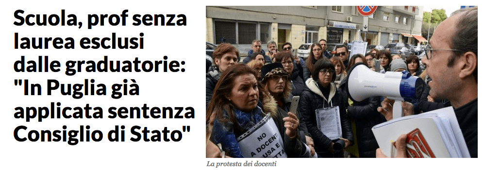 A nulla sono dunque valse le rassicurazioni della ministra Fedeli che assicurava di aspettare parere dell’avvocatura dello Stato prima di fare qualsiasi mossa. In Puglia si licenzia e si depenna dalle GaE? E’ la conclamazione del fallimento dei ricorsi? Probabilmente si, anche se le maestre e i maestri precari non ci stanno e in massa hanno protestato davanti la sede dell’USR pugliese, ma a nulla è valso. L’UST di Lecce ha già emanato una nota indirizzata ai dirigenti scolastici delle scuole pugliesi con la quale chiede di stipulare supplenze solo fino al 30 giugno e per di più non saranno convocati i diplomati magistrali inseriti con riserva T nelle graduatorie ad esaurimento.