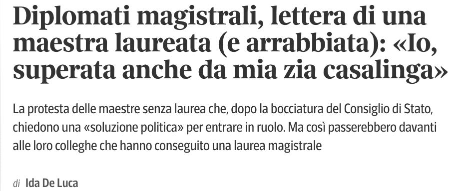 La sentenza dell’adunanza Plenaria – come vi abbiamo più volte raccontato – ha messo fuori dalle GaE i diplomati magistrali e questo ha comportato anche lo scioglimento dei contratti anche di quelle maestre che avevano ottenuto il ruolo e superato l’anno di prova. Al loro fianco tuttavia si sono schierati i sindacati di Base, ma anche i confederali e persino alcuni fra i principali partiti politici come ad esempio Forza Italia, mentre le maestre per protesta si sono incatenate davanti al MIUR. “Queste care colleghe che si sono incatenate davanti al Miur – prosegue la lettera pubblicata dal Corriere -, portando avanti scioperi e dimostrazioni, sono contrarie al dover tornare in seconda fascia (dove sono collocati i laureati) perché dopo anni e anni di servizio non possono ritornare a fare supplenze lontano da casa e che poi saranno retribuite con non poco ritardo… i laureati invece sì, devono fare la gavetta! Perché 5 anni di studio, 30 esami, innumerevoli laboratori e 600 ore di tirocinio son pochi… Le stesse però sono contrarie al vincolo dei 36 mesi di servizio negli ultimi otto anni, il che non dovrebbe essere minimamente un problema dal momento che si vantano di aver portato avanti la scuola italiana negli ultimi decenni…”