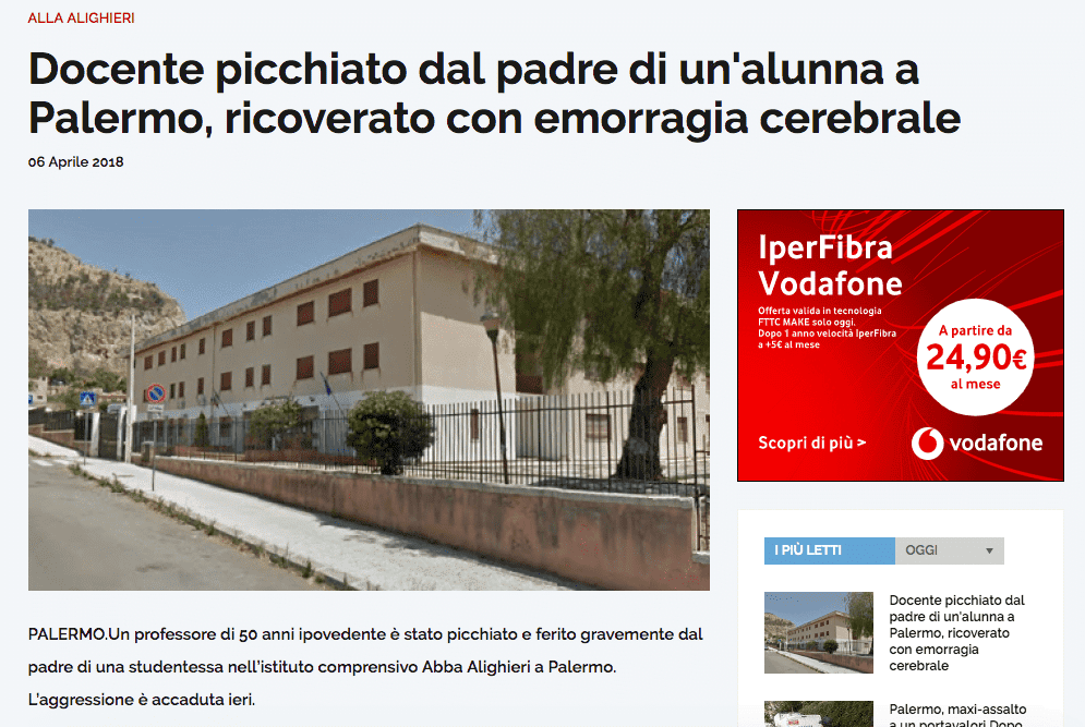 Non si arresta la violenza nei confronti dei docenti. L’ultima vittima è un docente cinquantenne di Palermo. Il professore, riporta l’edizione palermitana del Giornale di Sicilia è stato aggredito da un genitore perchè aveva ripreso la figlia. E’ successo all’istituto comprensivo Abba Alighieri di Palermo. Il docente peraltro è ipovedente questo forse gli ha impedito di schivare l’aggressione.
