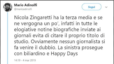 Il contenuto del messaggio affidato al social è chiaro e pungente così come quello scritto quando ha smascherato l’ex ministro dell’Istruzione Fedeli: “Nicola Zingaretti ha la terza media e se ne vergogna un po’, infatti in tutte le elogiative notine biografiche inviate ai giornali evita di citare il proprio titolo di studio. Ovviamente nessun giornalista si fa venire il dubbio. La sinistra prosegue con biliardino e Happy Days.”