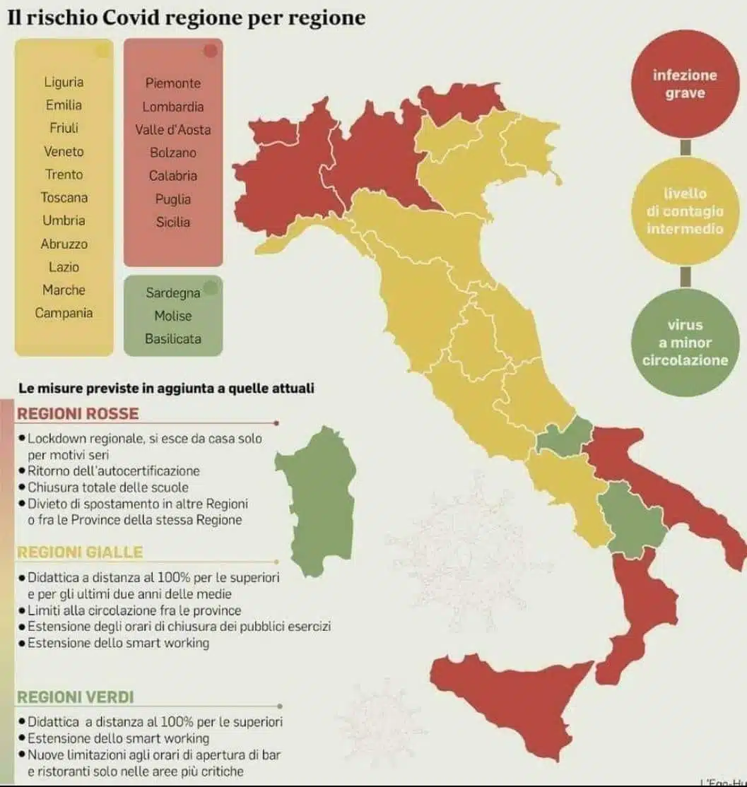 Le regioni più a rischio sono quelle segnate in rosso, dove i contagi sono maggiori. In quelle segnate in verde tuttavia le superiori continueranno con la didattica a distanza per le superiori.