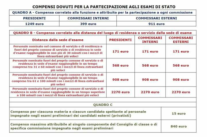 Ai presidenti andranno 1249 Euro, ai commissari esterni 911 Euro e ai commissari interni 399 Euro.