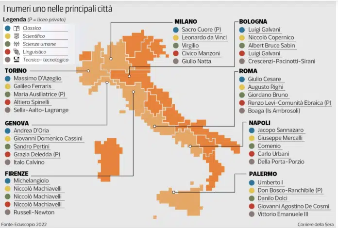 Eduscopio ha redatto una mappa interattiva ripresa poi dal Corriere della Sera che vede, per fortuna una distribuzione delle eccellenze un po’ su tutto il territorio nazionale.