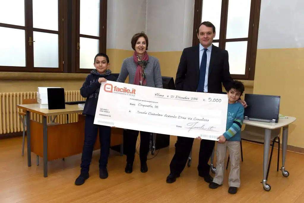 In occasione della consegna ufficiale del fondo e dei materiali, Facile.it ha annunciato che, a partire dall’anno scolastico 2017 – 2018, sarà aperto un bando a tutte le scuole primarie pubbliche d’Italia che, tramite la pagina https://www.facile.it/scuola.html, potranno presentare il proprio progetto affinché venga valutato da una commissione creata ad hoc. Il migliore riceverà ancora una volta asset di tecnologia provenienti dalla dotazione dell’azienda e un fondo da 5.000 euro per la realizzazione del progetto stesso.