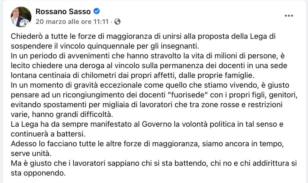 Dopo le pressioni finalmente è stata firmata l’Ordinanza Ministeriale che da il via alla Mobilità del personale docente ed ATA, ma il vincolo quinquennale rimane, la Lega e in particolare l’on. Sasso, non mantengono le promesse. Delusione da parte dei docenti che restano immobilizzati così come gli anni precedenti. Sul web si leggono già commenti di sconforto.
