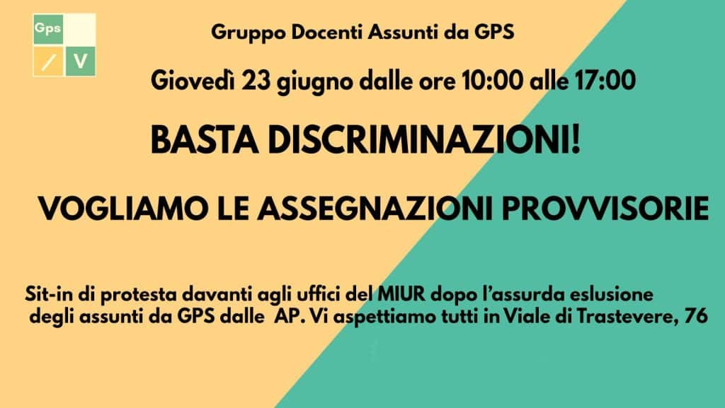 Stanchi per l’ennesima assurda esclusione anche dalle Assegnazioni Provvisorie noi DOCENTI VINCOLATI – assunti da GPS, annunciamo che il 23 giugno dalle 10:00 alle 17:00 saremo davanti agli uffici del Ministero dell’Istruzione in Via del Trastevere a Roma per manifestare tutto il nostro dissenso.