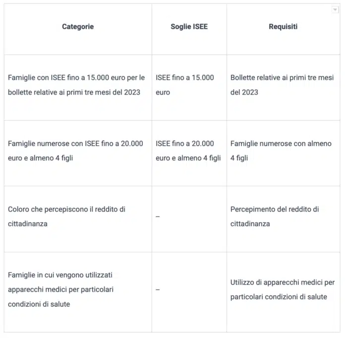 Nella tabella che trovate ad inizio articolo, si prega di notare che per le categorie “Coloro che percepiscono il reddito di cittadinanza” e “Famiglie in cui vengono utilizzati apparecchi medici per particolari condizioni di salute”, non sono specificate soglie ISEE perché i requisiti si basano su criteri diversi.