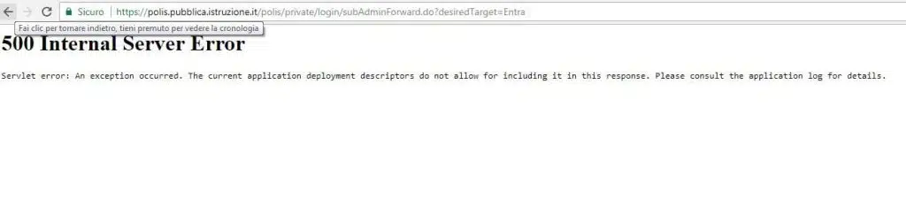 Alcuni nostri lettori hanno segnalato disagi dovuti ad un problema tecnico ad istanze online. Le cause del problema con molta probabilità sono dovute ad un sovraccarico dei server che ospitano il portale del MIUR, infatti il messaggio che viene restituito agli utenti che provano a loggarsi è il seguente: “500 Internal Server Error – Servlet error: An exception occurred. The current application deployment descriptors do not allow for including it in this response. Please consult the application log for details”. Istanze online è estremamente importante per gli aspiranti ATA che in questi giorni stanno ultimando la domanda di iscrizione alle graduatorie di terza fascia di istituto valevoli per il triennio scolastico 2017/2020. Attraverso il sistema polis dovranno poi scegliere le 30 istituzioni scolastiche destinatarie della propria domanda.