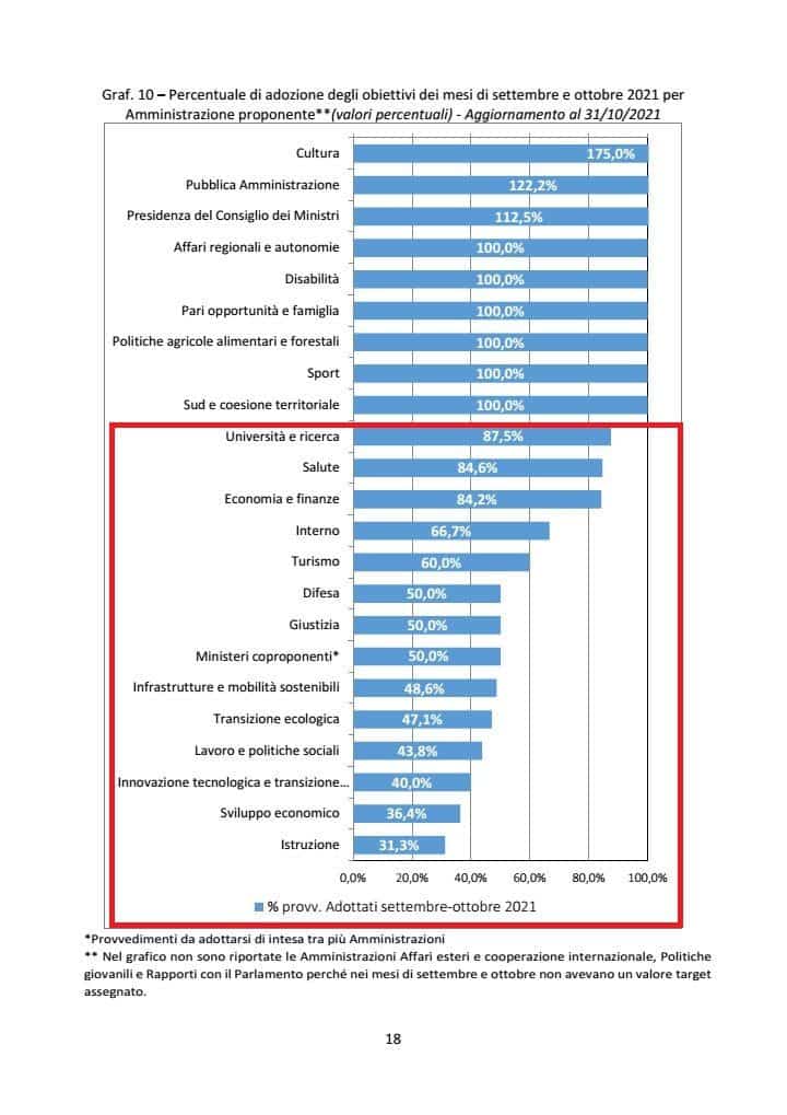 Un confronto impietoso quello del ministero dell’Istruzione a guida Bianchi rispetto a quello di guida Azzolina. L’ex ministra nel precedente Rapporto presentato da Garofoli nel luglio 2021 vantava una percentuale del 75% del raggiungimento degli obiettivi dati.