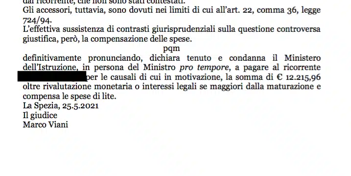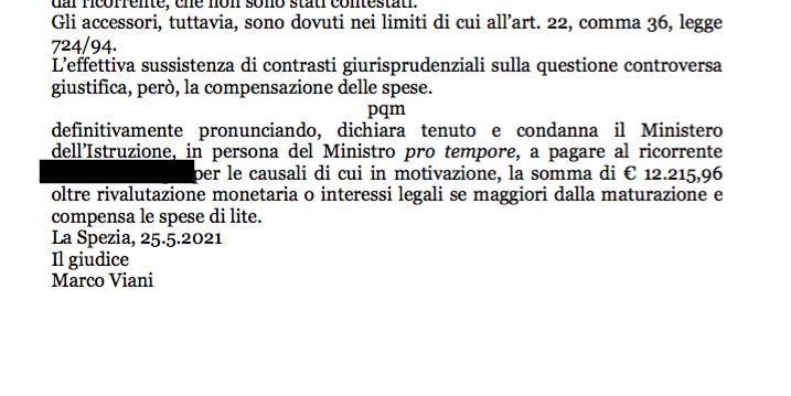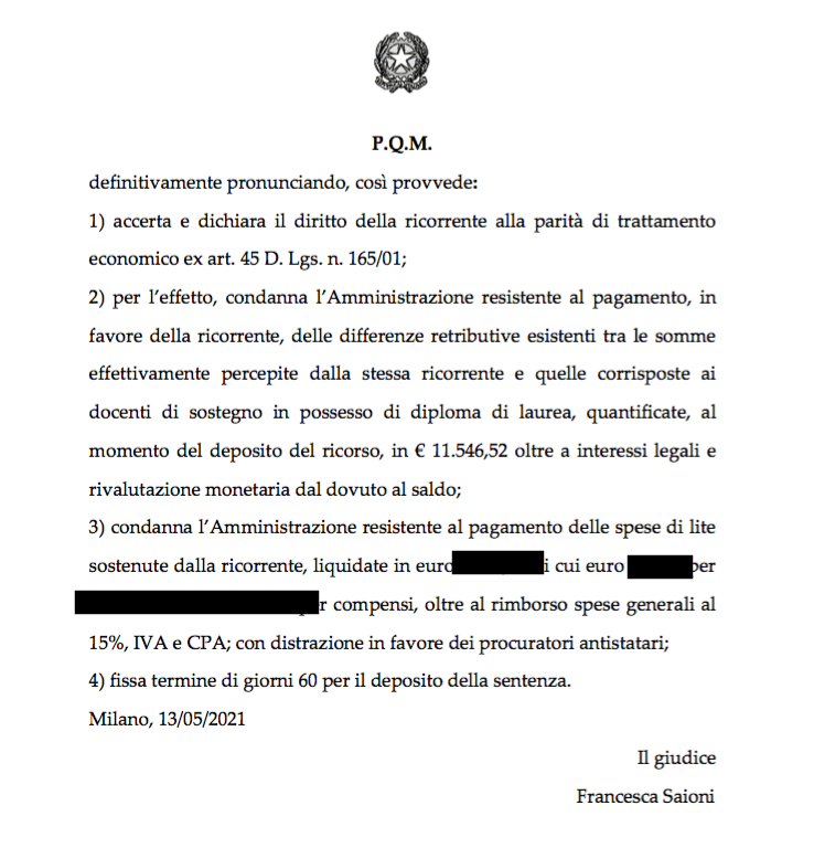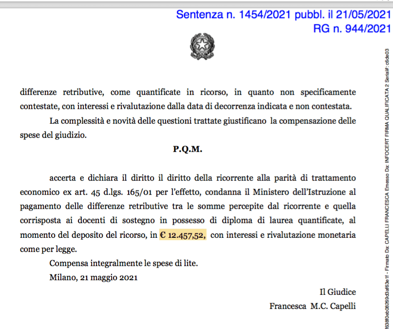 Le ultime sentenze riguardano ancora Milano (2), La Spezia (1) e novità assoluta adesso anche in Calabria, a Cosenza. Il giudice del lavoro ha riconosciuto il diritto di un Insegnante Tecnico Pratico specializzato sul sostegno dell’equiparazione economica al pari del suo collega laureato.