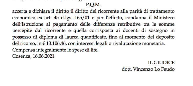 Le ultime sentenze riguardano ancora Milano (2), La Spezia (1) e novità assoluta adesso anche in Calabria, a Cosenza. Il giudice del lavoro ha riconosciuto il diritto di un Insegnante Tecnico Pratico specializzato sul sostegno dell’equiparazione economica al pari del suo collega laureato.