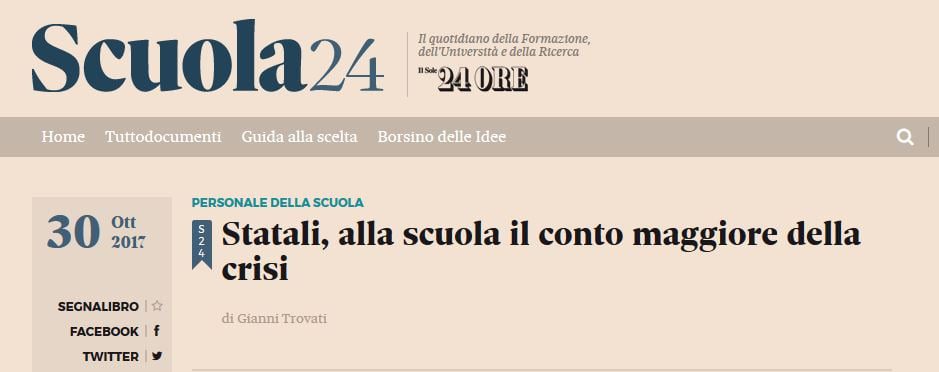Il Sole24Ore, con un articolo a firma di Gianni?Trovati, ha evidenziato come la scuola a differenza di altri settori abbia pagato un conto maggiore. Il giornalista evidenzia che: “Dal 2010 lo stipendio medio reale nella scuola ha perso il 12,4% del proprio potere d’acquisto, e quello dei tecnici dell’università ha lasciato per strada l’11,8%. Nello stesso periodo, la busta paga tipo nelle Autorità indipendenti (Antitrust, Privacy, Energia eccetera) è cresciuta del 7,6%, negli enti pubblici come l’eterno abolendo Cnel o DigitPa (oggi agenzia per l’Italia digitale) è aumentata del 7% mentre Palazzo Chigi non segna impennate, ma riesce comunque a difendersi dal carovita: e a conservare il +23,5% raggranellato prima della crisi. Insomma: nella pubblica amministrazione la cultura non paga, l’autonomia sì”. Da questi numeri si evince quale sia il vero interessa della politica nei confronti della qualità della scuola, negli investimenti e soprattutto nella valorizzazione del personale.