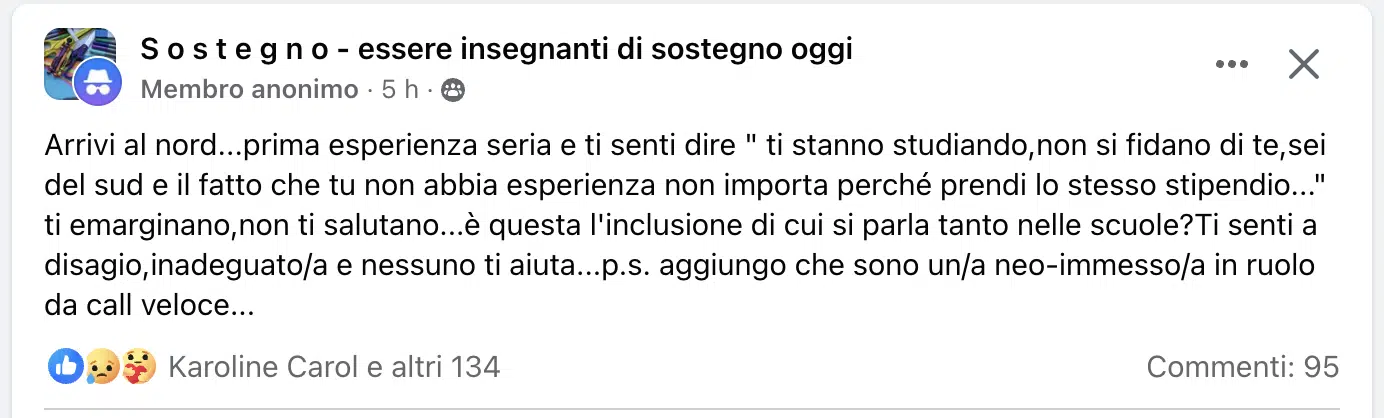 In un gruppo di docenti di sostegno su Facebook, un insegnante del Sud neo-immesso in ruolo al Nord tramite Call Veloce si sfoga denunciando la presunta “accoglienza” e “inclusione” di “certe” scuole e di “certi” insegnanti che si definiscono inclusivi. Non tutte le scuole sono così, per fortuna e non tutti i docenti sono così esclusivi, ma abbiamo voluto dare visibilità allo sfogo riscrivendo interamente il commento affidato a Facebook che comunque riportiamo consci che quella di questo docente non è l’unica esperienza negativa.