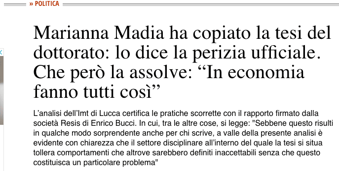 La ministra Madia, quella che ha firmato la riforma del pubblico impiego e previsto i licenziamenti per i dipendenti pubblici eccetera eccetera, ha copiato la tesi di laurea. A smascherarla una perizia. La notizia è stata riportata dal quotidiano Il FattoQuotidiano che maramaldeggia sulla stessa perizia che stranamente poi assolve la ministra perché in Economia farebbero tutti così. Richiamando alla memoria altri episodi del passato come “telefonavano tutti” o “erano tutti mafiosi”.