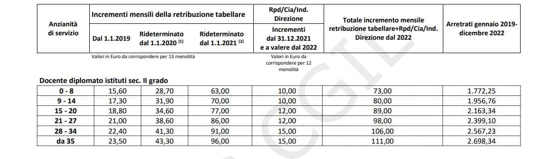 L’ultima colonna della tabella riporta gli arretrati che saranno erogati assieme alla tredicesima 2022.