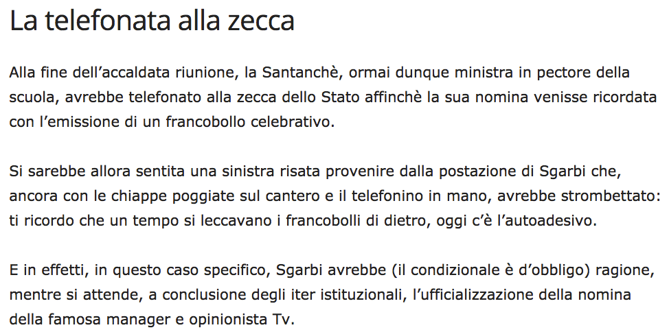 Ma la notizia della Tecnica delle Scuola appare come una boutade da primo aprile, infatti in un altro stralcio leggiamo: “se la notizia venisse confermata, dopo il primo aprile certamente, la Daniela Santanchè dovrebbe guidare il ministero di Viale Trastevere, quello che fu di Gentile e di Spadolini, ma anche di due donne del centrodestra, Letizia Moratti e Maria Stella Gelmini.