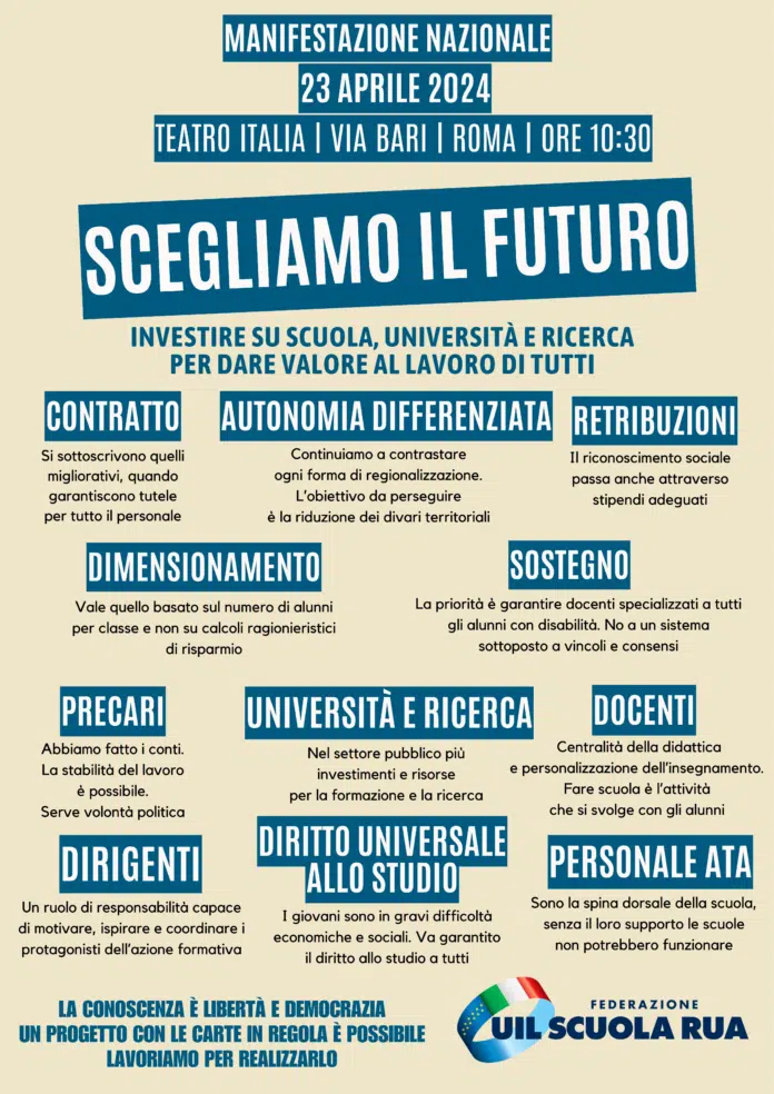 Martedì 23 aprile Uil Scuola Rua indice una manifestazione nazionale per denunciare le criticità del settore dell’istruzione e proporre soluzioni concrete. L’appuntamento è al Teatro Italia di Roma alle 10:30.