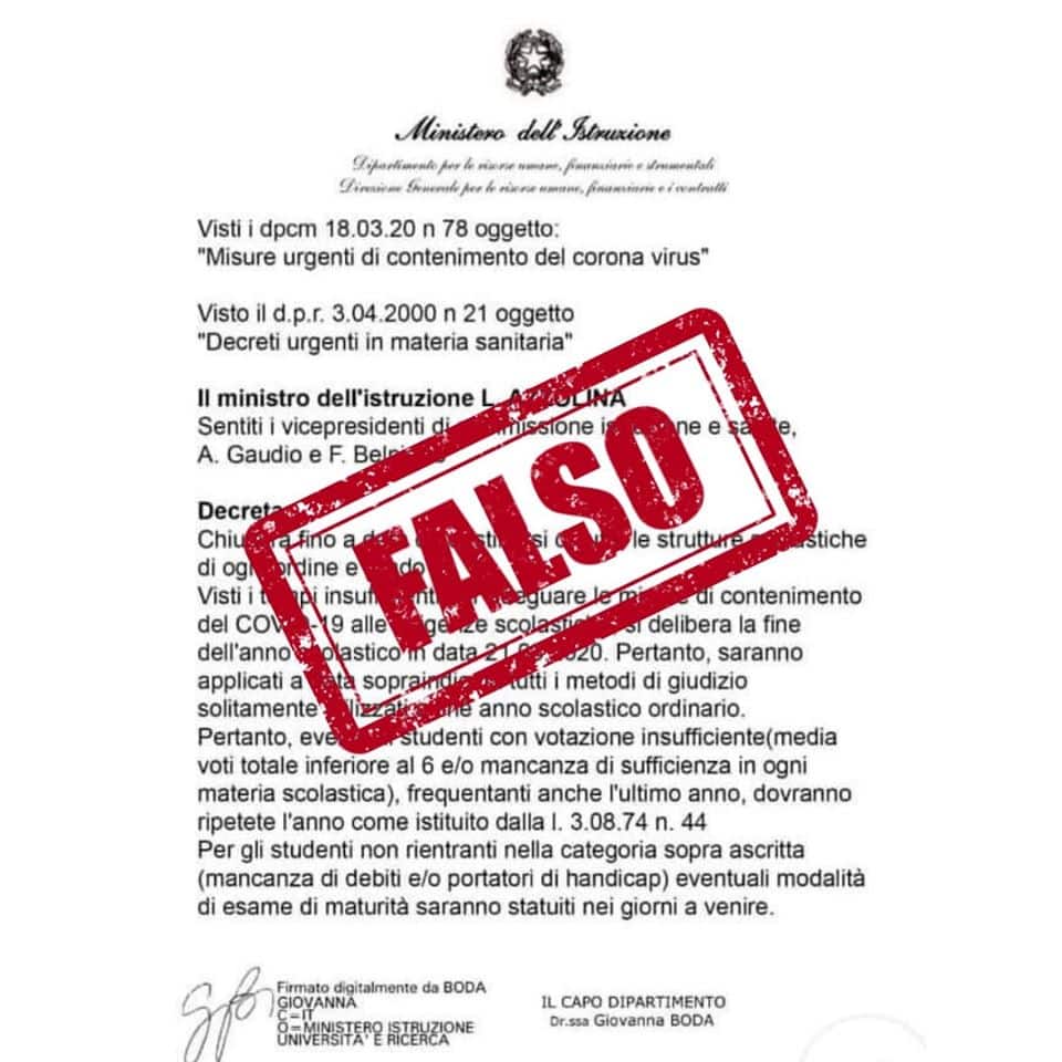 La denuncia arriva dalla ministra dell’Istruzione Azzolina, attrarverso la sua pagina Facebook è costretta a smentirla: “Sta girando questo documento. È un FALSO! Il momento è delicato. E c’è ancora chi gioca in questo modo. Lo trovo vergognoso. Denunceremo. Intanto chiedo a tutti di seguire solo fonti ufficiali. Dove pubblichiamo tutto. E ringrazio quanti, nella stampa, ci stanno aiutando a dare informazioni corrette”.