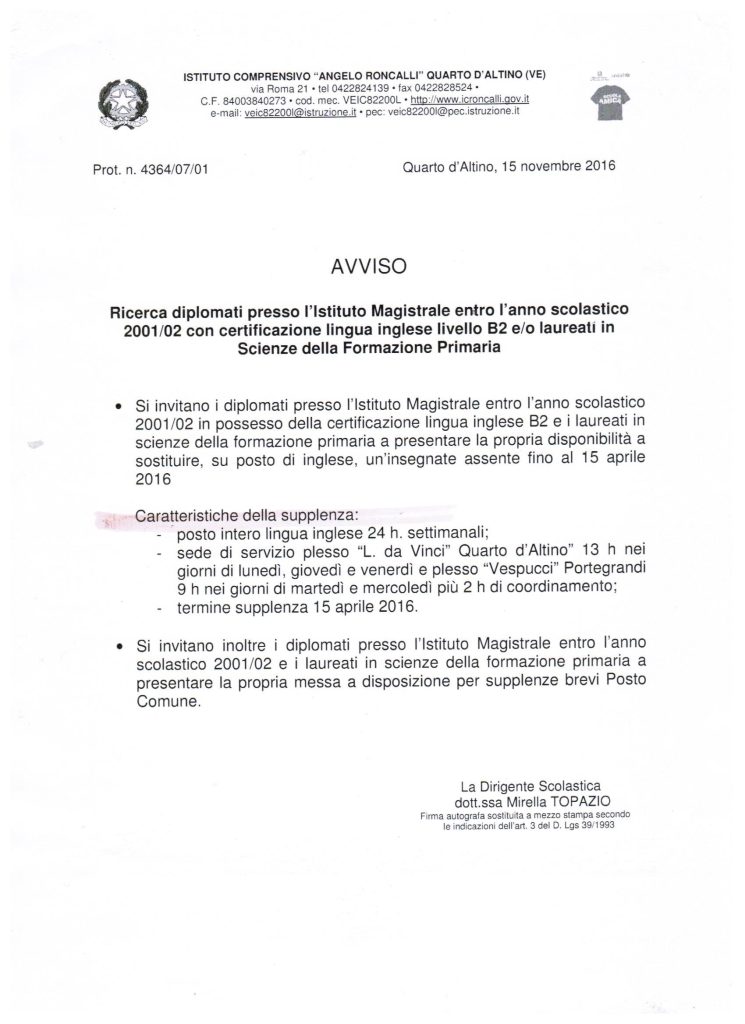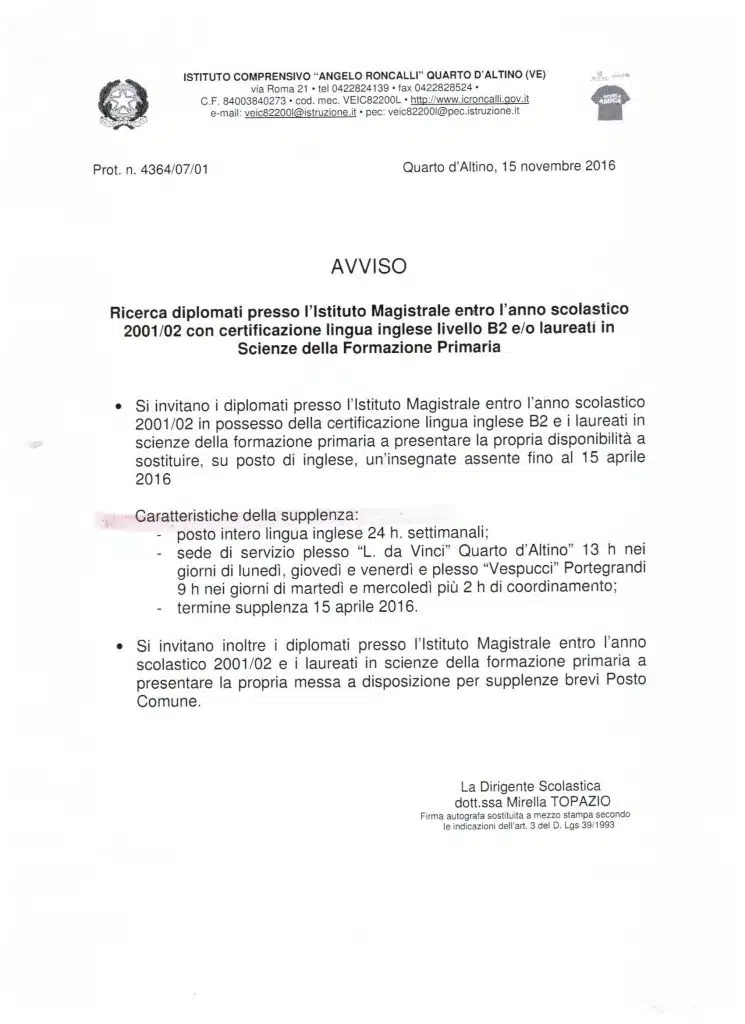 E’ possibile inviarVi l’avviso che ha pubblicato la scuola nella speranza che qualche maestra risponda e possa proporsi come insegnante?