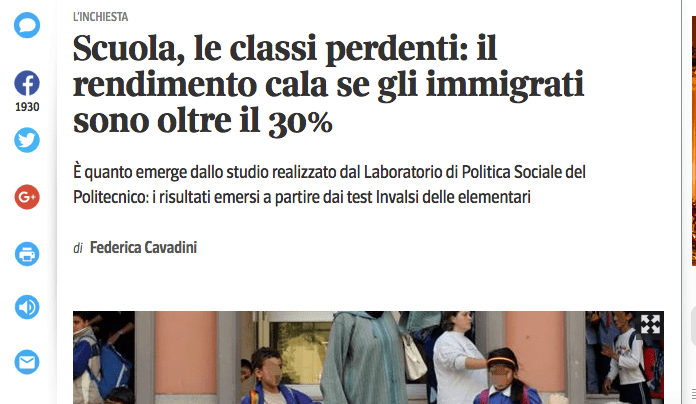 La controprova la si ha – sempre secondo la ricerca condotta dal Politecnico – nelle classi dove la presenza degli stranieri risulta bilanciata in questo caso il rendimento è in linea con le altri classi della città meneghina. “Alle medie – riportiamo dalla pagina web del quotidiano – la differenza fra scuole diventa più sfumata, lo scarto fra italiani e stranieri però rimane, basta leggere i dati raccolti dal ministero dell’Istruzione su promossi e bocciati. Alle superiori gli stranieri restano indietro, la stangata del primo anno c’è per tutti ma con percentuali diverse, fra gli italiani i respinti sono il 12 per cento, fra quelli con altra cittadinanza sono più del doppio (28 per cento) e alla fine del ciclo ci sono ancora due velocità, 4 per cento contro il 14 per cento. Ecco che cosa mostra l’analisi del Politecnico sui dati Invalsi di quinta elementare e terza media. «La performance scolastica cala quando nelle classi si supera la quota del 30 per cento di stranieri, è una soglia cruciale che dovrebbe essere evitata o comunque monitorata», è la sintesi di Costanzo Ranci, docente di Sociologia economica, autore della ricerca e del volume White Flight a Milano”.