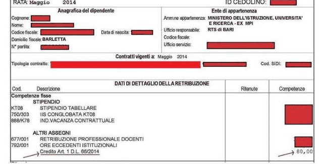 La pubblicazione del cedolino da parte di NoiPa comprende anche il bonus di 80 Euro, dove lo troviamo? Sotto che voce? Sono queste alcune delle domande che si pongono i lavoratori della scuola, ma più in generale di tutto il pubblico impiego. Nel cedolino non si trova la voce bonus di 80 Euro pensi si fa riferimento alla legge che l’ha introdotto, ovvero il D.L 66/2014). Tale DL è stato reso definitivo dalla legge di stabilita? 2015- legge 23.12.2014 n. 190 art. 1 comma 12) SOLAMENTE chi ha un reddito inferiore ai 24.000 e proporzionale per un reddito tra i 24.000 ed i 26.000 euro: NATURALMENTE chi ha il part-time viene avvantaggiato in quanto potrebbe non aver diritto con orario intero (ad esempio docente elementare posizione 15 e averne diritto con part-time di 12 ore).