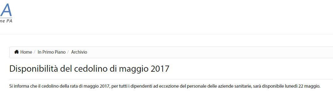 Come al solito si affida a poche ma significative parole: “Disponibilità del cedolino di maggio 2017 – Si informa che il cedolino della rata di maggio 2017, per tutti i dipendenti ad eccezione del personale delle aziende sanitarie, sarà disponibile lunedì 22 maggio”.