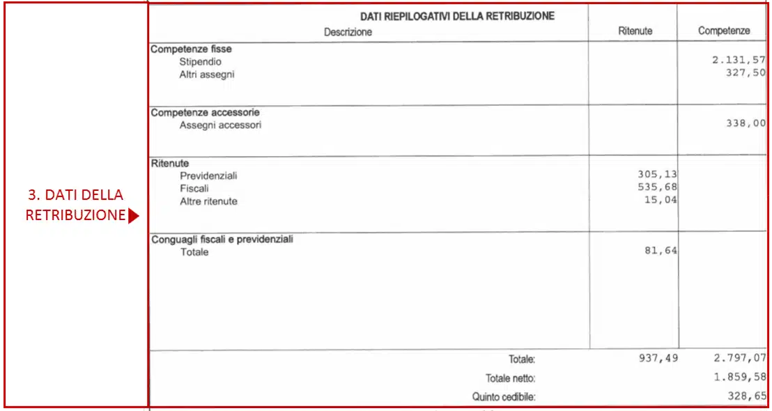 Si tratta di un altra sezione particolarmente importante poicho sono indicati i dati di riepilogo delle retribuzione, ovvero i soli importi totali riguardanti: