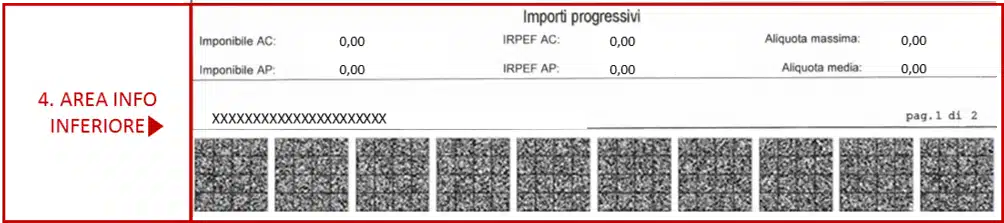 Chiudiamo lo speciale relativo alla prima pagina del cedolino, in questo caso, di aprile 2018 con la prima pagina, con la parte inferiore dello statino. Tale sezione contiene gli importi progressivi e i codici bidimensionali necessari alla certificazione del cedolino.