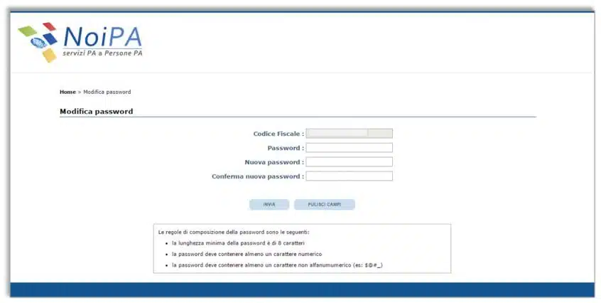 Per la vostra sicurezza consigliamo di modificare la vostra password almeno ogni 3/4 mesi. La modifica della password impedisce ai malintenzionati di appropriarsi del vostro profilo e quindi di accedere agli archivi e ai servizi offerti da NoiPa.