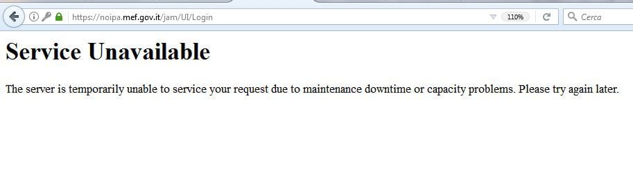 Il portale NoiPa restituisce questo messaggio: ” Service Unavailable – The server is temporarily unable to service your request due to maintenance downtime or capacity problems. Please try again later”.