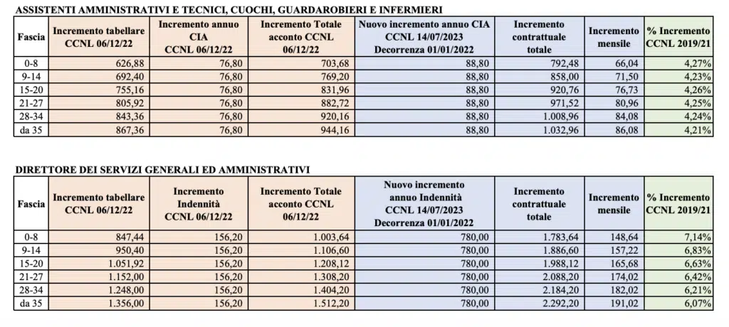 Da come si evince dalle tabelle stipendiali, si possono verificare le seguenti voci: incremento tabellare, indennità annue, acconto di dicembre 2022, nuovo incremento indennità da gennaio 2022, totale contrattuale, aumento mensile e percentuale del rinnovo.