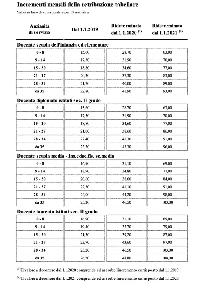 Per i docenti è previsto un aumento della retribuzione professionale docenti (RPD) che passa da 194,80 a 304,30 euro. Sale anche il compenso individuale accessorio (CIA) da 79,40 a 87,50 euro.