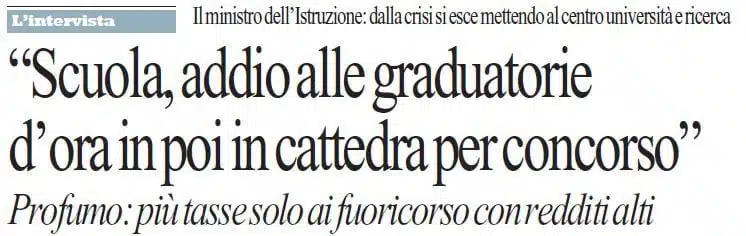 «Ventunomila nuovi docenti entrano in classe fra tredici giorni, presi dalle graduatorie storiche. Altri ventiquattromila saranno insediati a settembre 2013, metà dalle graduatorie, metà dal nuovo concorso che stiamo organizzando. Altri diecimila insegnanti in primavera: metà assunti dalle graduatorie, metà con un bando».