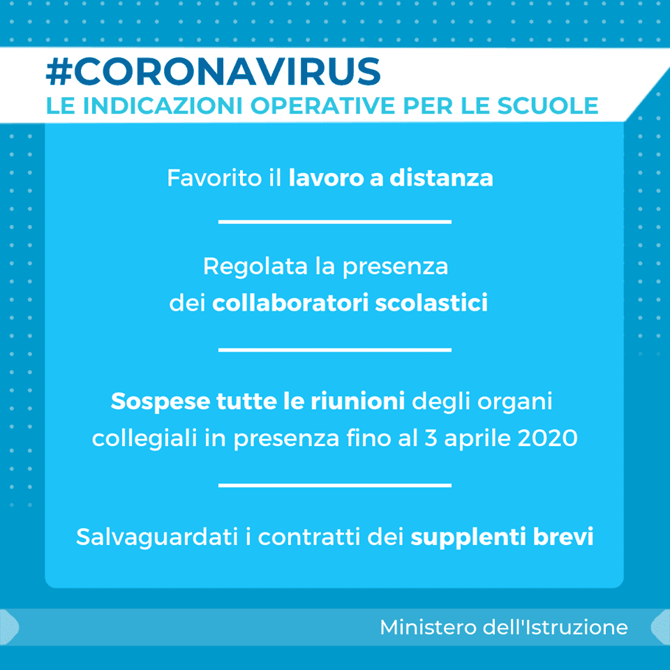 Nelle istituzioni scolastiche del sistema nazionale di istruzione sono sospese tutte le riunioni degli organi collegiali in presenza fino al 3 aprile 2020. Si raccomanda di valutare attentamente l’opportunita? di mantenere impegni collegiali precedentemente calendarizzati, riducendo allo stretto necessario gli incontri organizzati in via telematica, al fine di lasciare ai docenti il maggior tempo possibile per lo sviluppo della didattica a distanza.