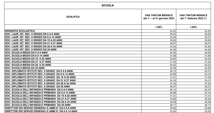 Tale emolumento, come da comunicato NOIPA, sarà attribuito con il cedolino del mese di luglio – insieme agli arretrati relativi al periodo da gennaio a giugno 2023, e poi mensilmente fino a dicembre 2023. ( vedi tabella in allegato).