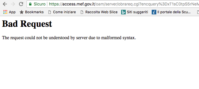 Il cedolino dello stipendio di maggio 2018 per la scuola, forze armate, sicurezza eccetera è stato pubblicato. Peccato che non riesca ad accedere all’area riservata. Il portale permette l’accesso alla Home, ma non all’area riservata. Chi ha provato a collegarsi e ad inserire le proprie credenziali ha dovuto fare i conti con questo messaggio: Bad Request – The request could not be understood by server due to malformed syntax.