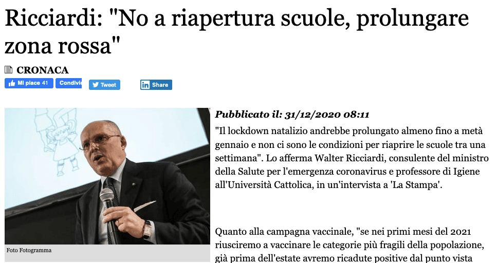 A sorpresa leggiamo su adnkronos il dottor Ricciardi, consulente del ministro della Salute si oppone alla riapertura delle scuole il 7 gennaio e consiglia di prolungare il lockdown natalizio fino a metà gennaio. “Per abbassare davvero la curva dei contagi, lo abbiamo visto, l’unica strada è quella di lockdown lunghi e nazionali. Anche la ‘zona rossa’ ora in vigore andrebbe prolungata, almeno fino a metà gennaio, se vogliamo vedere effetti positivi. Se dal 7 gennaio, di colpo, facciamo riprendere tutte le attività, assisteremo certamente a un rialzo della curva epidemica” Continua: “So che è impopolare dirlo, ma non è il caso. Si possono riportare i ragazzi in classe solo con una circolazione bassa del virus, non con quella attuale. Le scuole sono ambienti sicuri, ma è la situazione esterna a sconsigliarne la riapertura. Altrimenti rischiamo di richiuderle nel giro di poche settimane”.