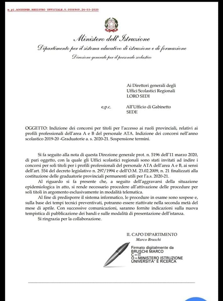 E’ stato rimandato il concorso 24 mesi del personale ATA. Il momento di emergenza sta spingendo il Ministero a trasformare tutte le operazioni in maniera telematica. Proprio oggi infatti è stata diramata la nota a firma del dott. Bruschi che alleghiamo qui di seguito.